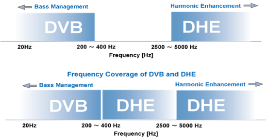 伝送系や再生系の周波数特性などの制限を補う画期的な音のエンハンス技術です。 重低音や、高音域のパワーアップだけでなく、くっきりとした音のコントラストが臨場感を更に増強します。