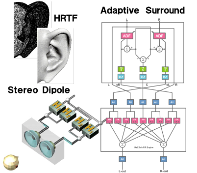 マルチチャンネルの音源を擬似的に受聴空間に再生する仮想音源処理技術です。 2スピーカ再生だけでなく、ヘッドホン再生においても自然で臨場感ある高音質な音場が再現できます。